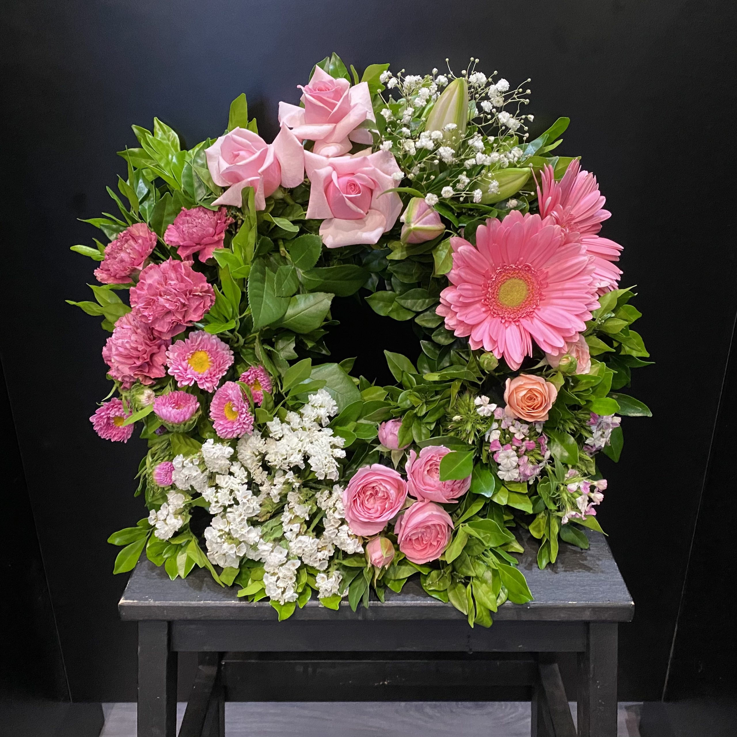 A wreath featuring seasonal flowers in pastel shades.