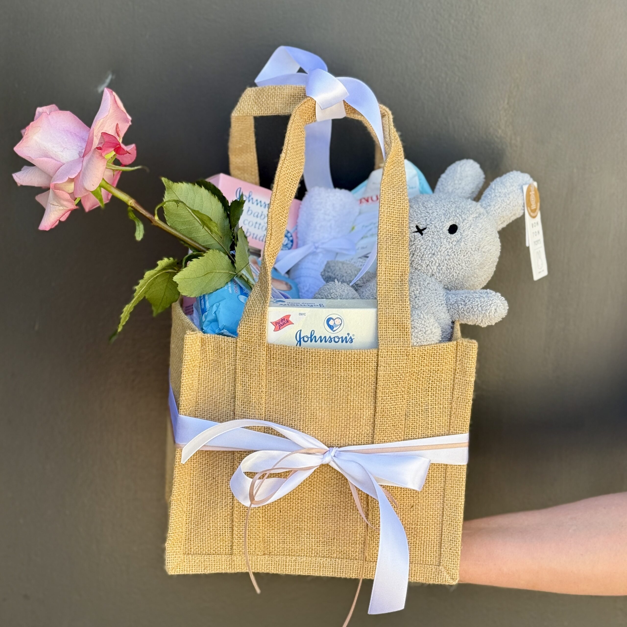 A Miffy of your colour choice, baby soap, baby wipes, cotton buds, Good Riddance Sensitive, pacifier, teething wipes, face cloth and a single rose all in a cute hessian bag!!
